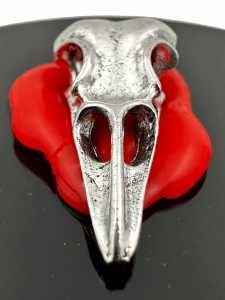 Le couvercle est orné d’un délicat crâne de corbeau en métal, collé à la cire chaude (fragile).
