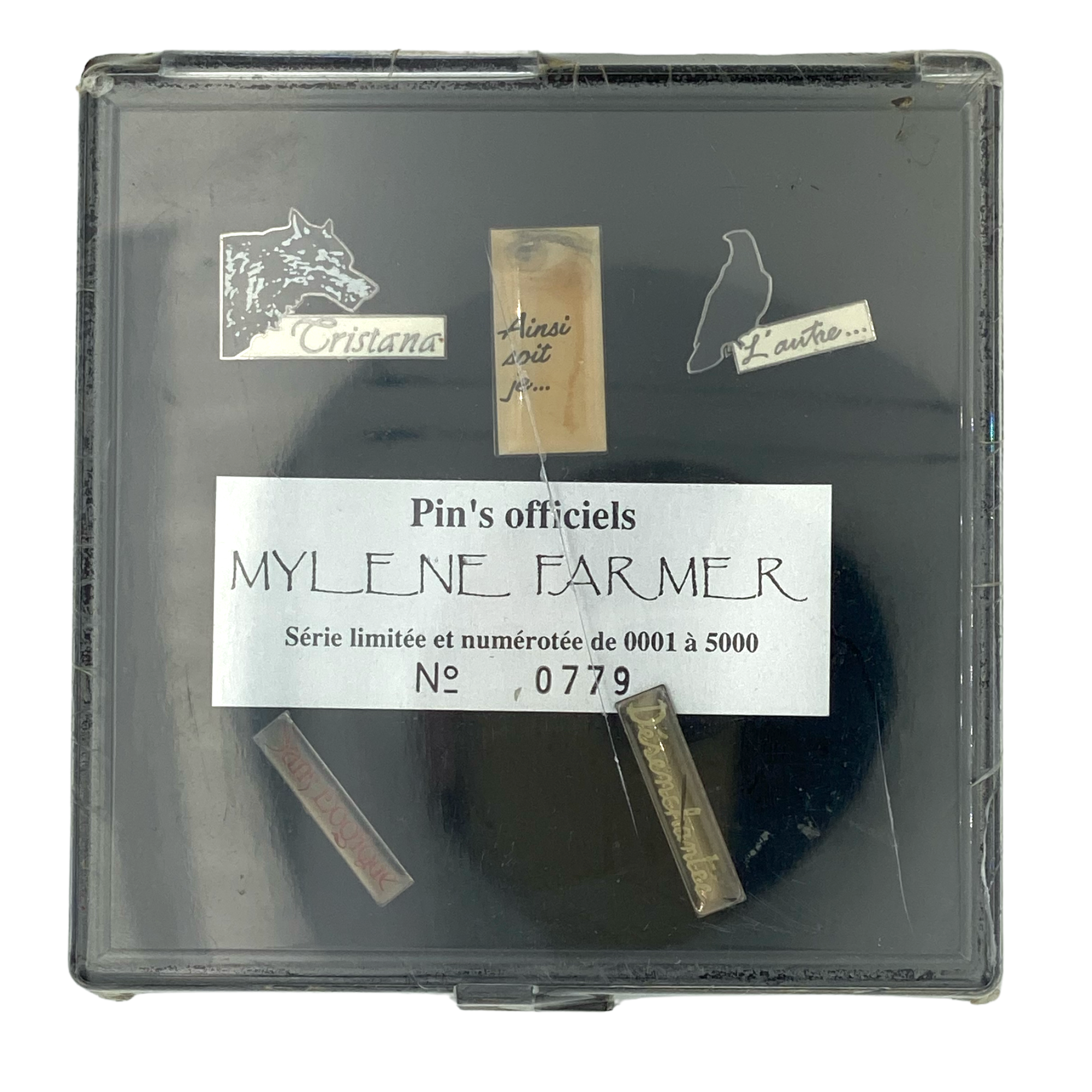 Coffret contenant 5 pin’s « Mylène Farmer ». Série limitée et numéroté à 5000 exemplaires.