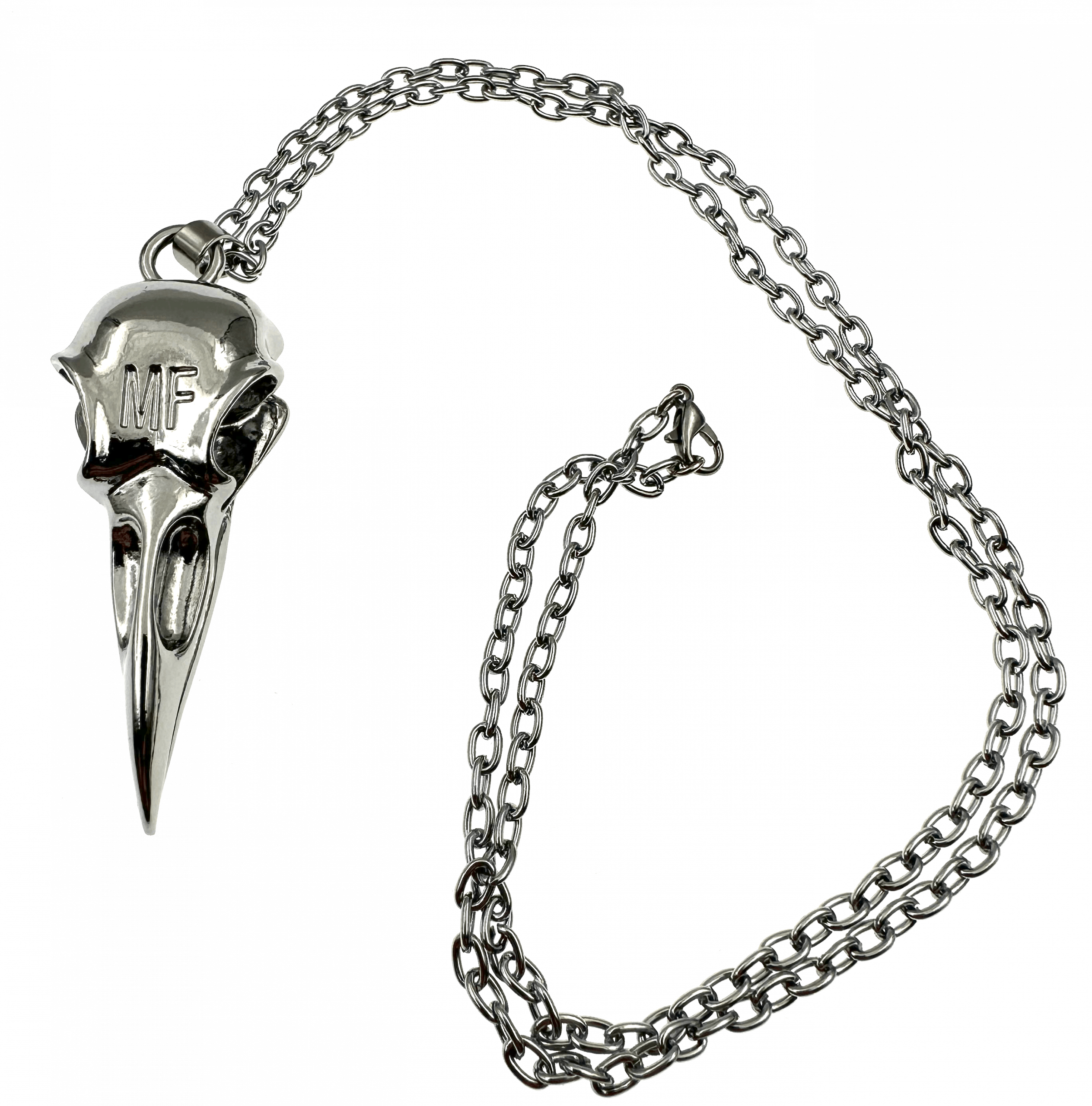 Collier argenté avec gravure MF sur le « front », disponible à la vente lors de la tournée Nevermore 2023 au prix de 30€.