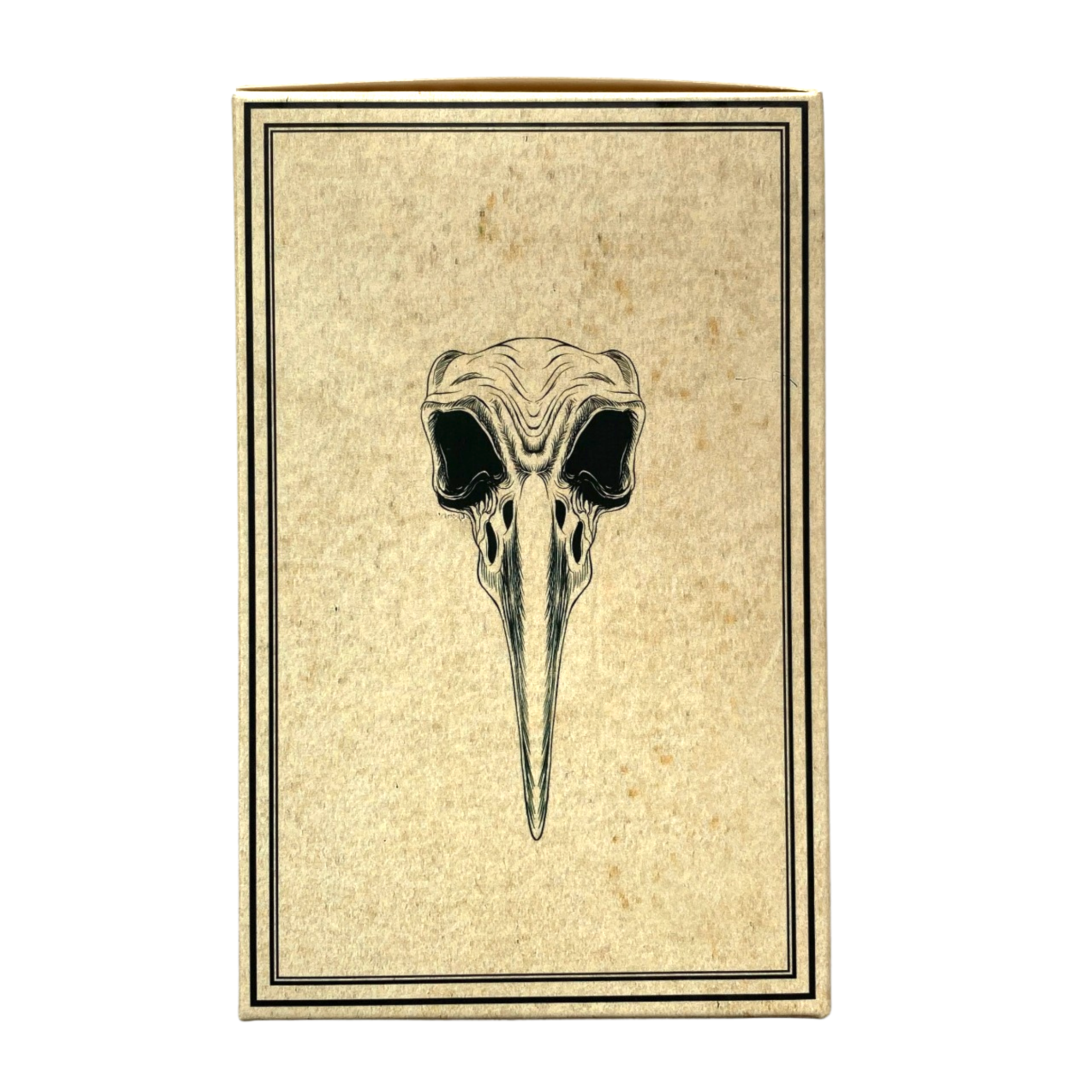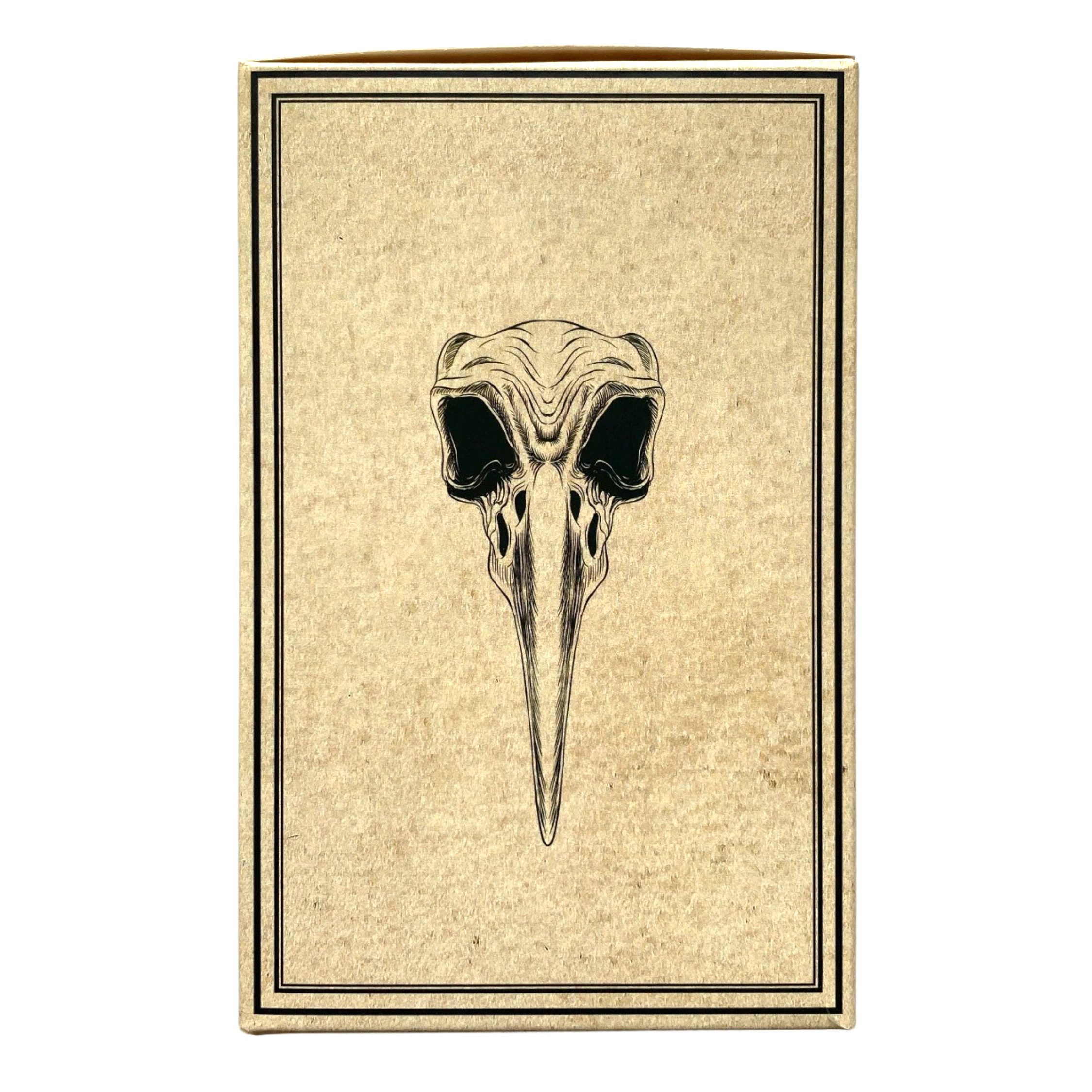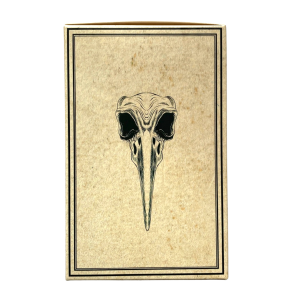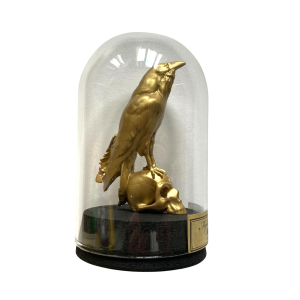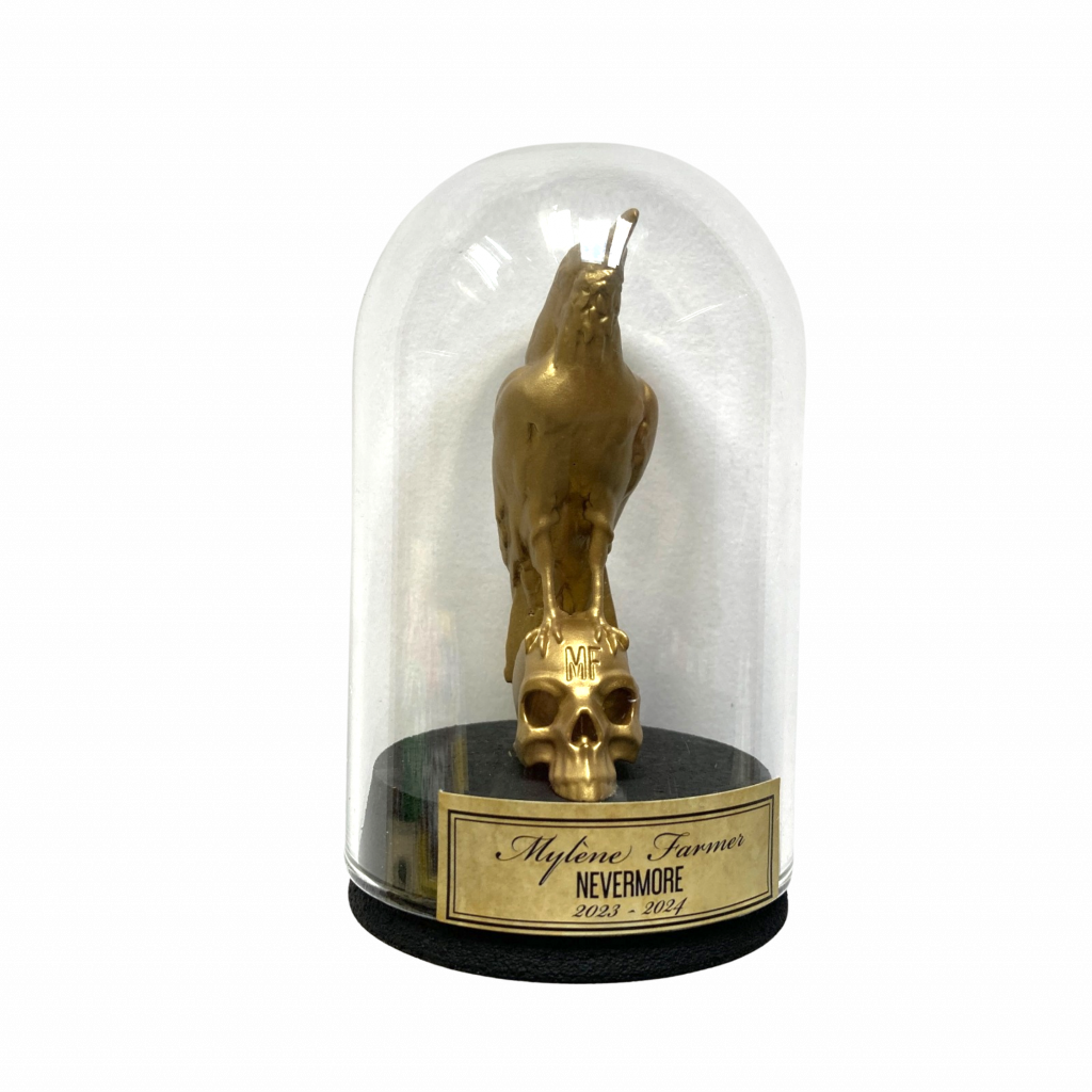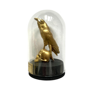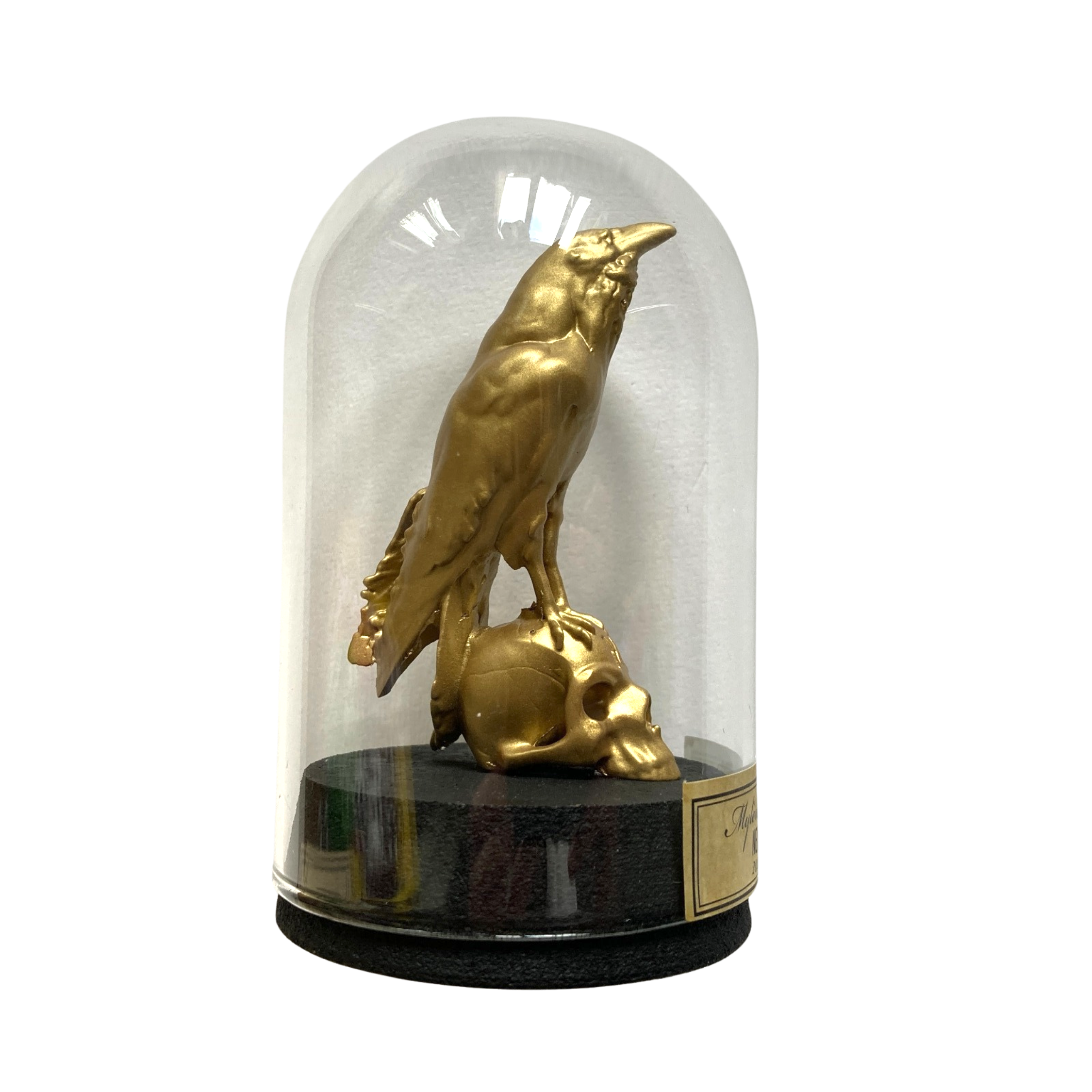 Globe en verre avec petit corbeau sur crane et etiquette. le tout bien protegé dans une boite en carton.