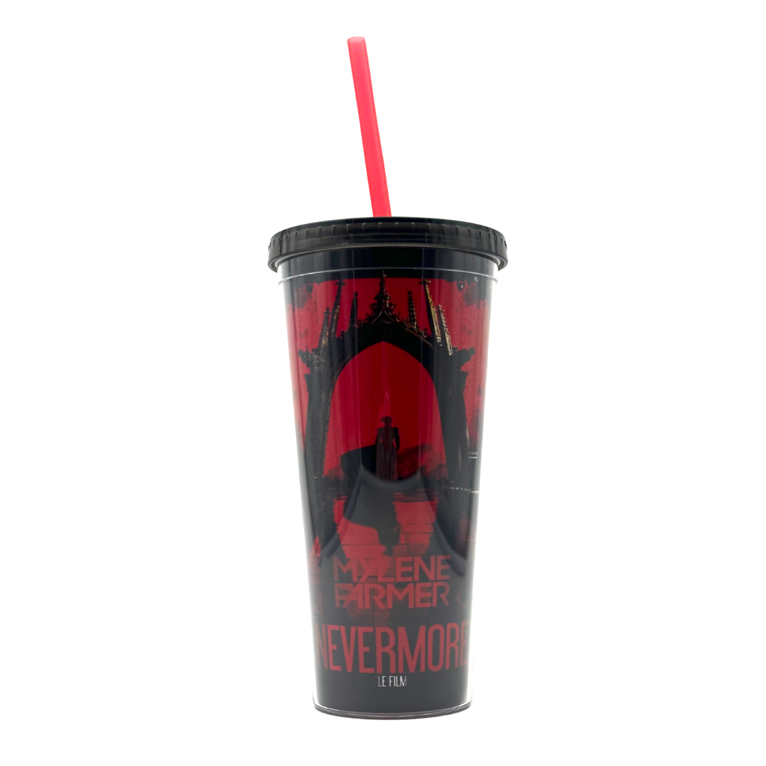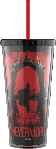 Gobelet réutilisable vendu exclusivement dans les cinémas projetant Nevermore – Le Film le 07.11.2024. Illustration complète du visuel du film (Mylène Farmer sous une arche gothique), avec le logo MYLÈNE FARMER – NEVERMORE LE FILM.
