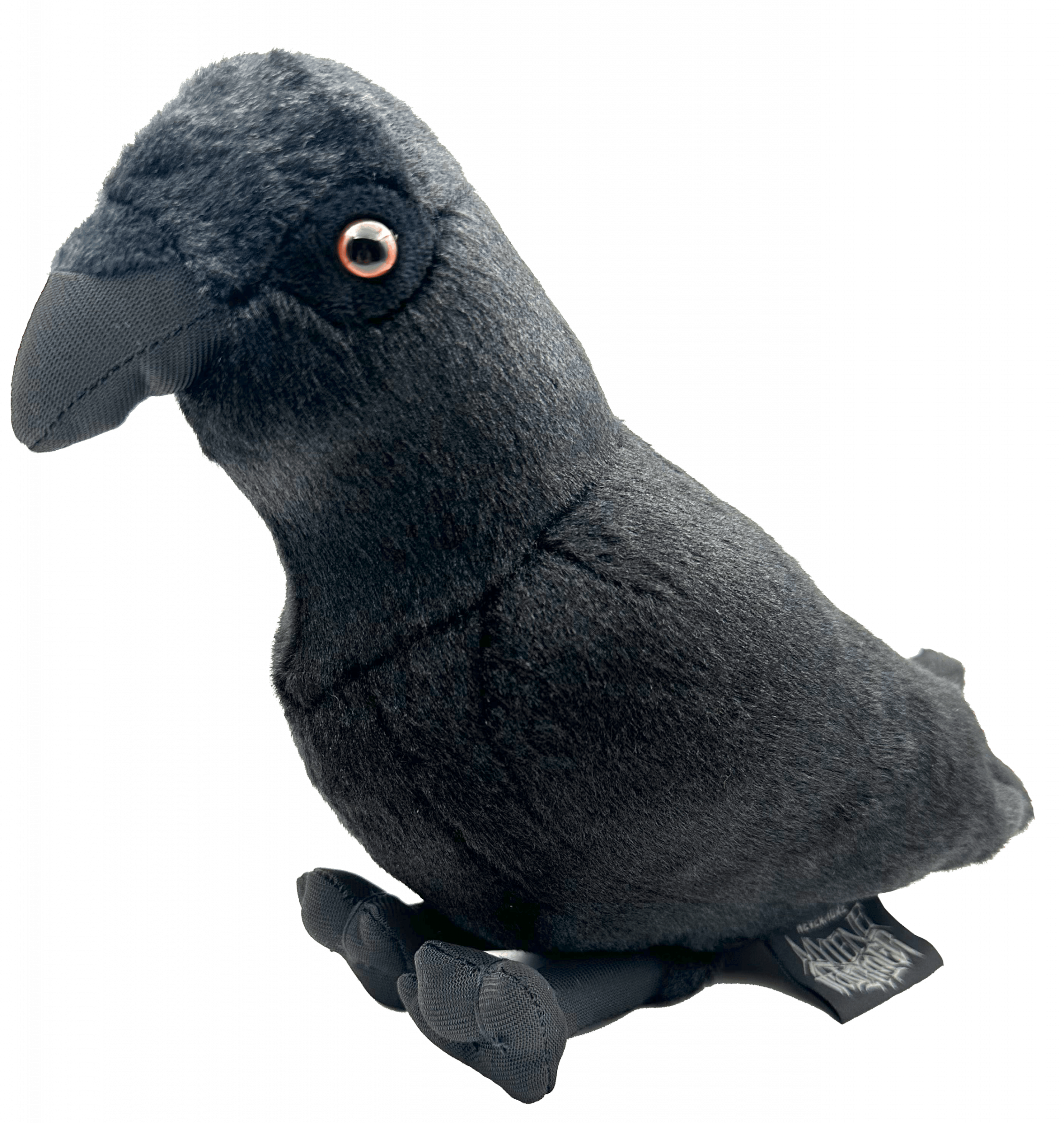 Peluche corbeau avec étiquette « Nevermore Mylène Farmer »