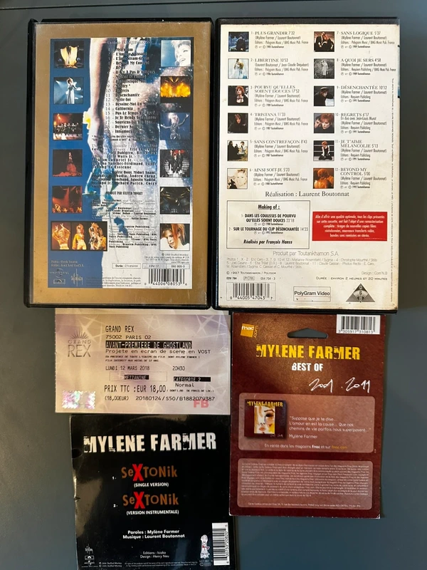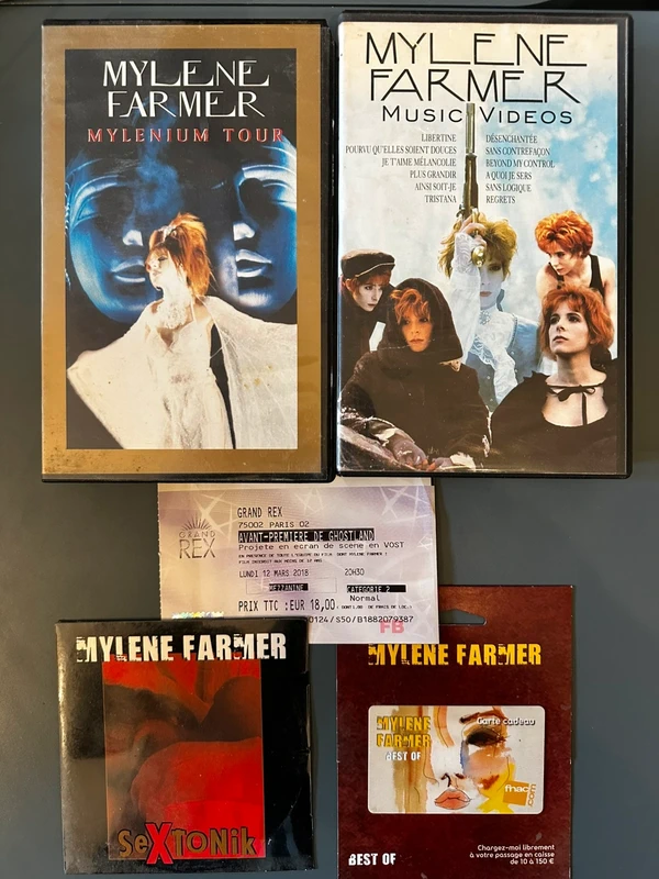 Contenu – VHS Mylenium Tour – VHS Music Videos compilation de clips – Ticket Avant premiere Ghostland au Grand Rex 2018 – CD single Sextonik – Carte cadeau FNAC Best Of Mylène Farmer objet promo