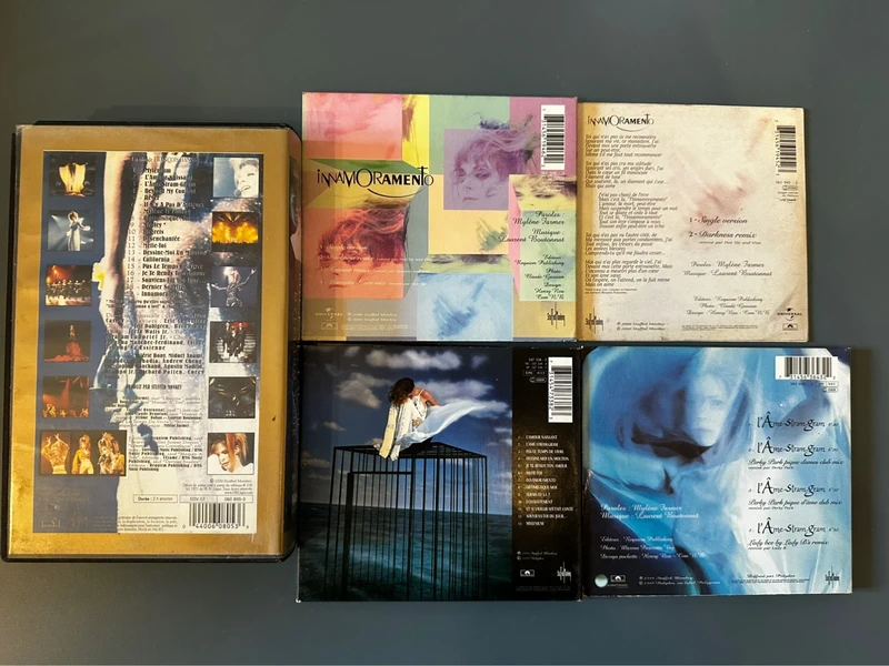 Le lot comprend : – VHS Mylenium Tour (édition dorée) – CD single Innamoramento – Maxi CD Innamoramento – Dance Remixes – Maxi CD L’Âme-Stram-Gram – Dance Remixes – L’album Innamoramento limité
